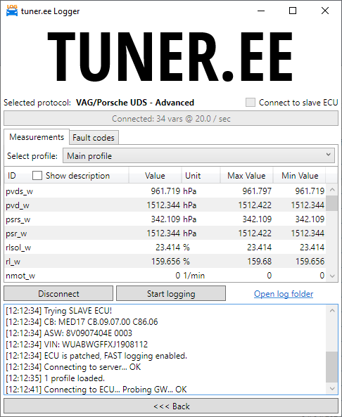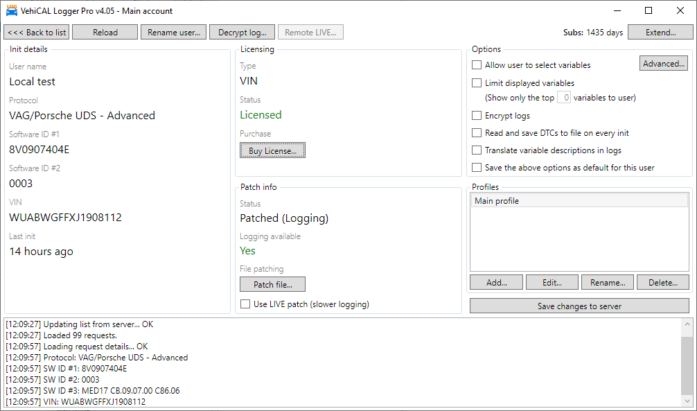 For a slave client to be able to log, there needs to be either at least one profile assigned or the Allow user to select variables option needs to be checked. For those advanced protocols that require a patch the ECU must also be initialized again after it has been patched.